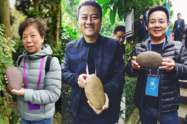 参观结束后,谭木匠还设置了一个暖心环节——放愿景石,97位来自全国各地的加盟商在谭木匠愿景林里放下了属于他们的许愿石。其中,加盟谭木匠18年的王丽名的许愿石上面写着:“左手染墨,右手繁华,只言片语,无法言说,谭木匠在我心灵深处留下的记忆,一辈子!”王丽名说,加入18年,她开了18家谭木匠专卖,而她的儿子今年也正好18岁,谭木匠对她来说就像是另一个儿子。